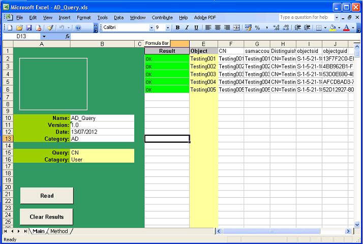 This spreadsheet is for the batch querying of multiple objects of the same type. LDAP attributes can be specified and compared against lists of objects in columns.