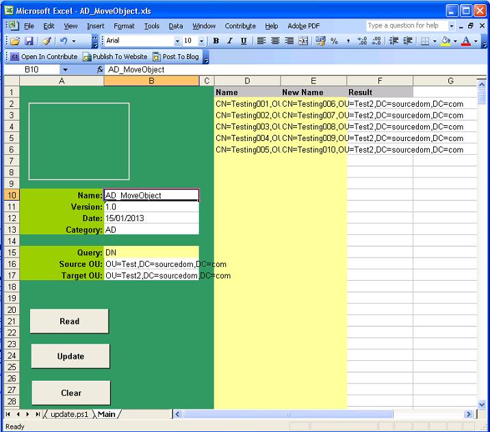 Will generate two Excel sheets called "Update.ps1" and "Rollback.ps1". Update.ps1 contains a powershell script that can be used by an administrator, The script will contain a series of commands that move or rename the objects in column D, New names are in column E. Rollback.ps1 will contain a complete reversal script that reverts the objects back to their original state.