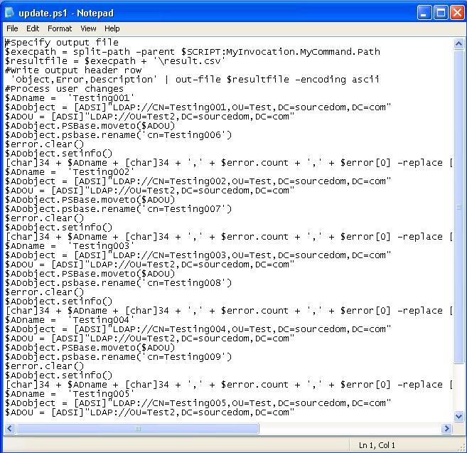Once update.ps1 is run, there will be no output on the command line if the script executes without error. Errors will be outputted in red text. The script will output the csv file into its execution directory called Result.csv.