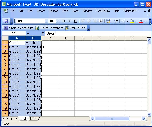 Once all the groups members have been read then the members will also be outputted in a list format in the list sheet. Each row will have a group name and member name. All the members to groups will be listed row by row until every member for every group has been listed.