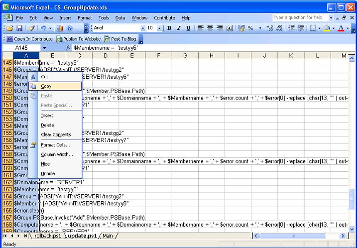 Within the "update.ps1" sheet highlight column A, right click and select copy.