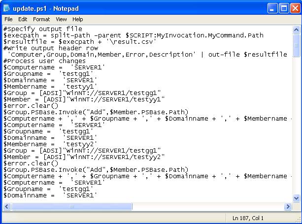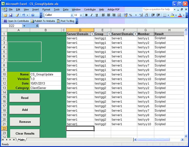 Once the spread sheet is populated with groups and members to be added or removed then select the "Add" button to create an addition script or select the "Remove" button to create a removal script.