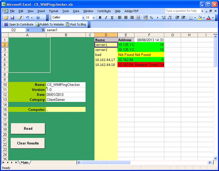Pings the Hosts in Column D and outputs the results to column E. Each new time read is selected then the next available column to the right will be timestamped and the millisecond response time will be populated in that column. |